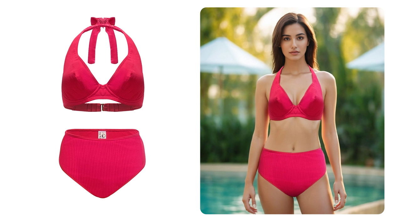 Our smart AI model creator handles everything automatically. Simply upload your product photo, and watch it transform into a professional listing-ready image with AI bikini models. Works with clothing, accessories, jewelry, and more